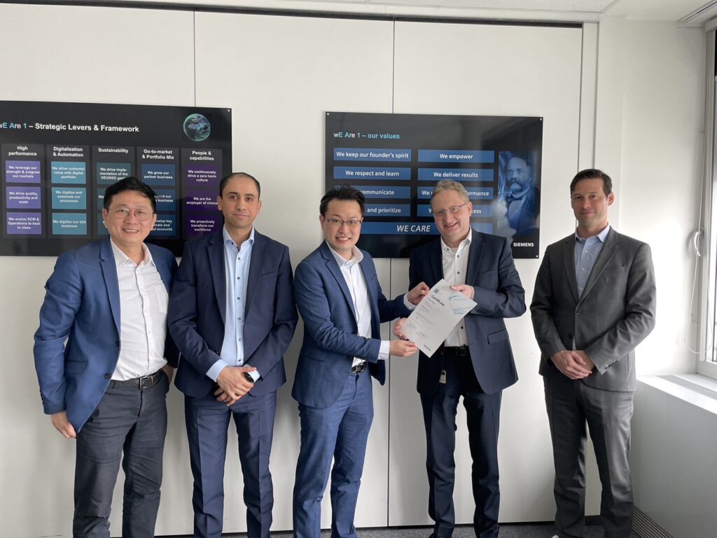 加雲聯網(ICP)成為台灣第一個、全球第七個西門子認證解決方案合作夥伴。圖左起: 西門子基礎建設事業部協理余成章、 Sales Director-Adnane Azmani、加雲聯網總經理廖佑晟、Global Director of Sales – Martin Berndsen(SI EA S CP)、Head of SI EM – Fabian Bergeron。圖 / 加雲聯網提供
