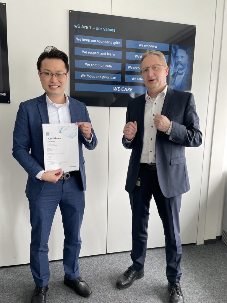 加雲聯網成為德國西門子公司總部認證經銷合作夥伴,西門子全球銷售總監Martin Berndsen 頒證給加雲聯網總經理廖佑晟(左)。圖 / 加雲聯網提供